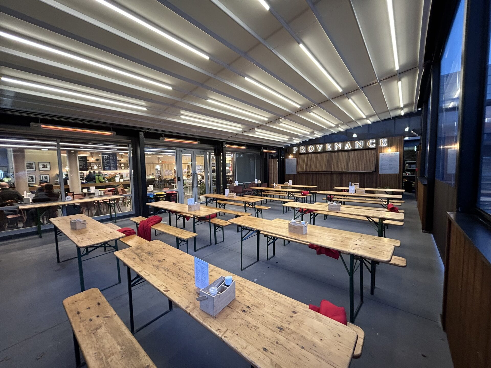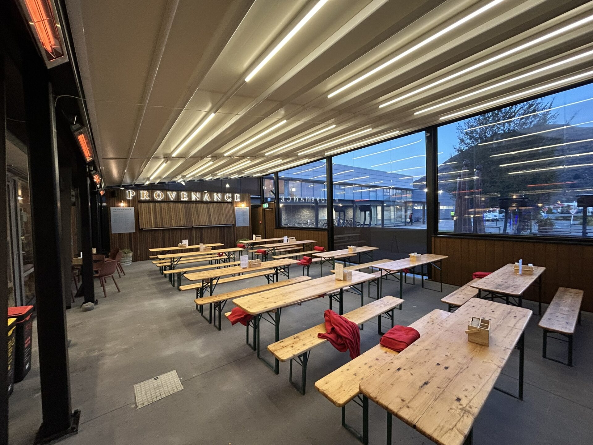 Retractable Oztech canopy with integrated heating and lighting installed at Provence, Queenstown Airport