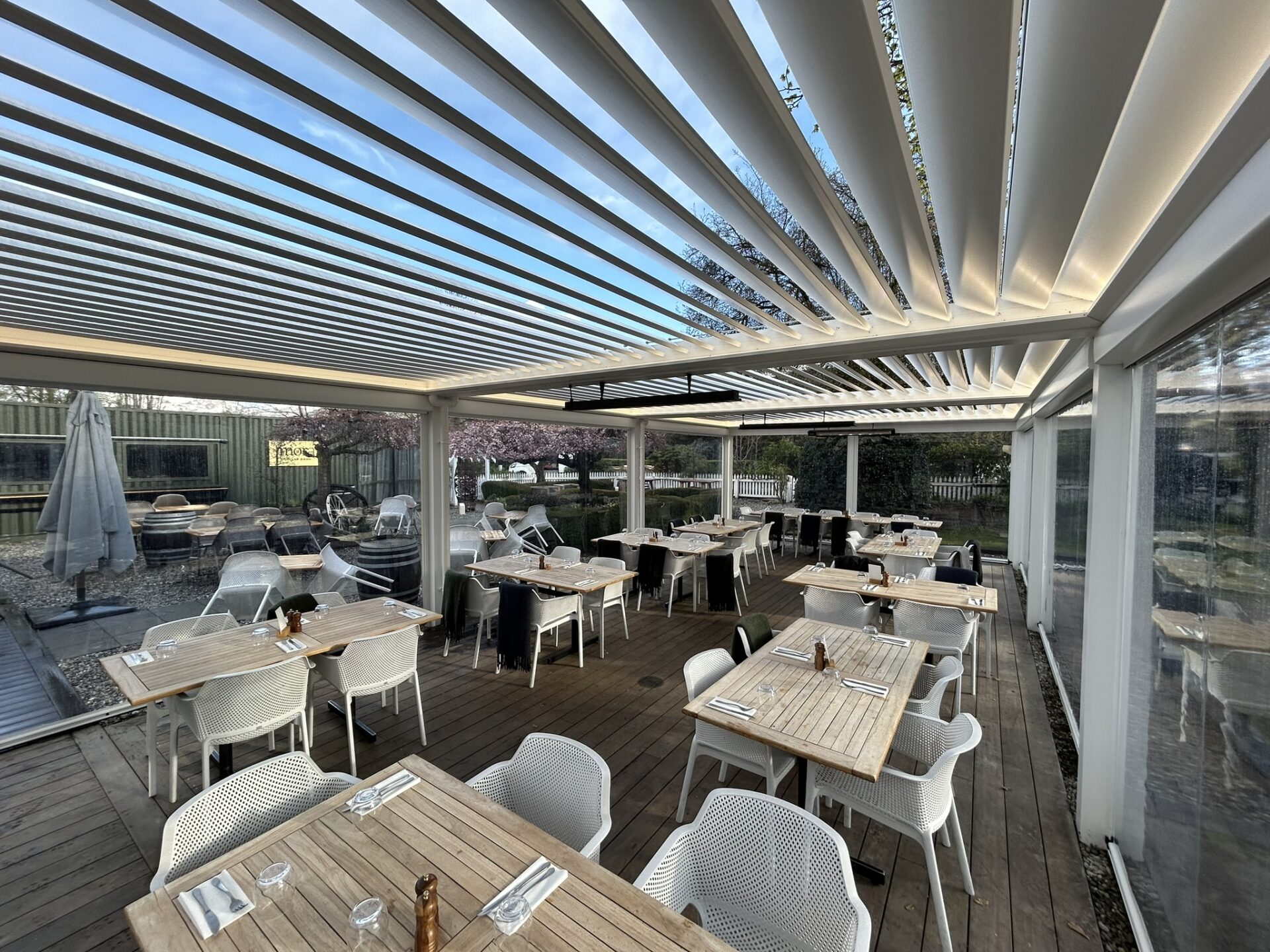 Louvre system installed for covered outdoor dining at Mora Wines & Artisan Kitchen, Queenstown
