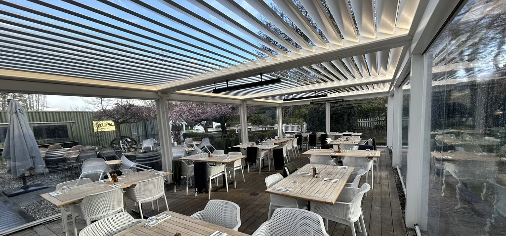 Mora Wines – Covered outdoor dining with louvre roof and Ziptrak screens.